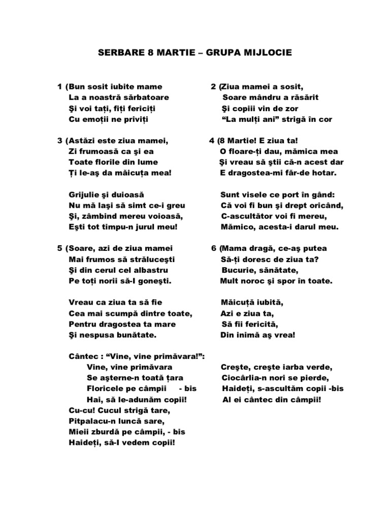 Program serbare grupa mijlocie. Micuții s au obișnuit deja cu programul și cu regulile impuse de colectivitate și abia așteaptă o serbare ca să și pună în valoare calitățile. Grupa mica 2012 serbare craciun. învăţământ preşcolar activitati optionale sărbători tradiţii grupa mică. Serbare de final de an iunie 2012 grupa mijlocie aceasta a fost serbarea noastra de final de an un mic carnaval dragut cu mult dans si miscare cu personaje dragute din povesti si veselie a fost frumos copiii incantati iar educatoarea multumita va doresc o vara frumoasa si ne vedem la toamna.