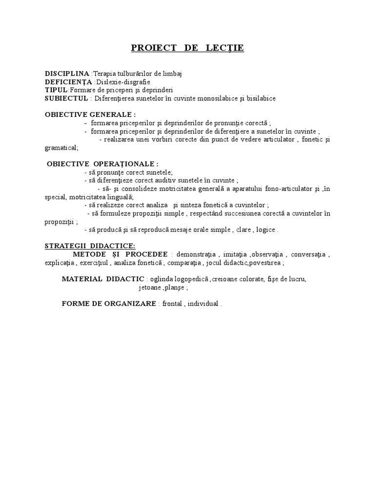 Proiect Didactic Logopedie Dislexie Disgrafie