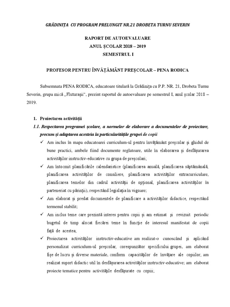 Raport de autoevaluare educatoare 2019. Raport de autoevaluare evaluare în vederea acordării calificativului anual pentru cadrele didactice din învăţământul preuniversitar. Contractul colectiv de munca 2019. Fisa de autoevaluare profesori 2019 2020. Raport anual de evaluare interna a calitatii.