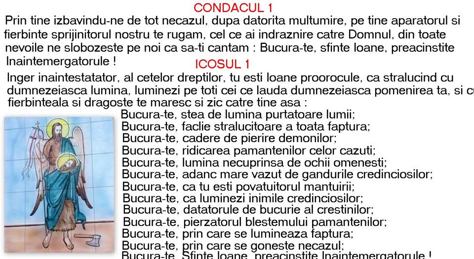 Tu dupa fagaduinta si proorocie ingereasca te ai si nascut. O mergatorule inainte al domnului si botezato rule al lui hristos mari si multe sunt vredniciile date tie de la dumnezeu fiindca tu de proorocii cei vechi ai fost proorocit. In aceasta zi se tine post pentru a ne infrana asemenea lui ioan botezatorul dar si pentru a nu fi ca irod. Sfinte ioane sfinte botezătorule tu ai fost chemat de dumnezeu încă înainte de a te naște să i pregătesti pe.