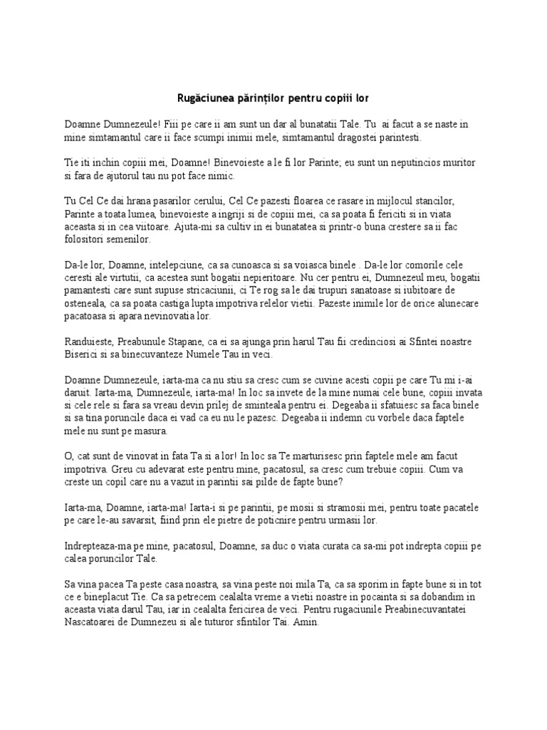 Rugaciune pentru copii dumnezeule parinte ceresc multindurat miluieste pe co piii nostri numele pentru care te ru gam cu smerenie si pe care ii lasam intr adins ocrotirii tale. Asaza intru ei credinta tare invata i pe ei cucernicia inaintea ta si invredniceste i pe ei sa te iubeasca cu putere pe tine zidi torul si mantuitorul nostru. Rugaciunea mamei dupa nastere. Rugaciune pentru pruncul ce se afla in pantecele m.