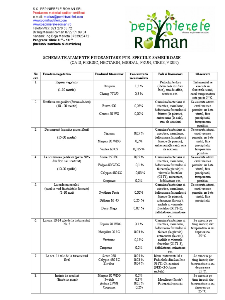 Schema tratamente fitosanitare pentru speciile samburoase cais. în general tehnologiile de protecție sunt diferențiate pe specii și chiar pe soiuri familii sau varietăți acestea având sensibilitate sa rezistență diferită față de anumite boli sau dăunători o schemă de. Pentru o protecție reușită a pomilor fructiferi este nevoie de o informare constantă și consistentă din partea fiecărui fermier sau deținător de astfel de specii. Cu precizarea că stopirile trebuie făcute și ținând cont de condițiile de vreme calendarul a fost foarte bine primit de restul pomicultorilor care l au apreciat ca fiind util.