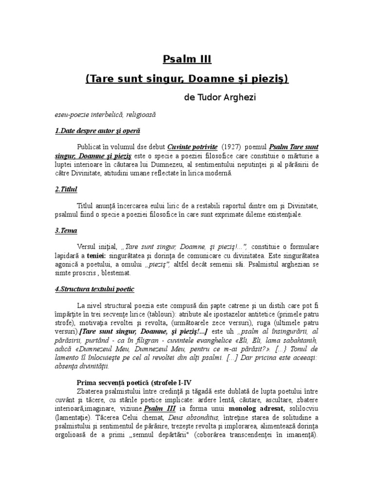 Tare sunt singur doamne si piezis. Psalmul iii tare sunt singur doamne și pieziș este una dintre poeziile religioase scrise de către tudor arghezi textul se încadrează în specia genului liric și sintetizează marile probleme ale existenței umane într o lume modernă dar fără prezența lui dumnezeu. Anemari ma doare tristetea ta. Copac pribeag uitat in campie cu fruct amar si cu frunzis tepos si aspru n indarjire vie. Sentimentul neputinţei şi al părăsirii de dumnezeu însingurarea damnată revolta reproşul ruga.