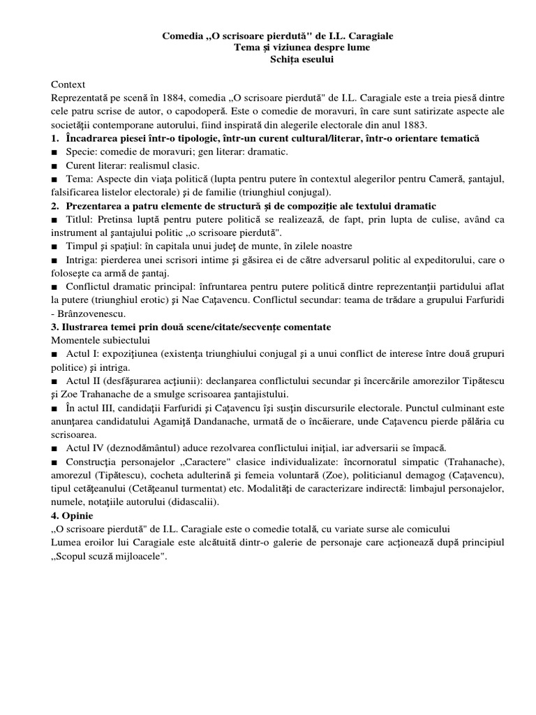 Comedie de moravuri care dezvaluie viata publica si de familie a unor politicieni care ajunsi la putere si rosi de ambitii. O scrisoare pierduta tema si viziunea despre lume i l. Comedie de moravuri sociale și politice considerată ca fiind emblematică dramaturgiei românești piesa o scrisoare pierdută ce aparține marelui dramaturg i l. Arta poetică modernă eu nu strivesc corola de minuni a.