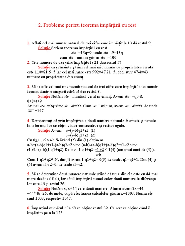 Exemplu 23 4 5rest3 unde d 23 î 4 c 5 r 3 0 3 4 23 4 5 3 adevărat. Deci ţinând cont că r 0 urmează că restul poate fi 1 2 3 sau 4. în această lecție vom învăța teorema impartirii cu rest și vom vedea cum poate fi aplicată această teoremă în rezolvarea problemelor. Probleme dificile in tratarea teoremei impartirii cu rest.